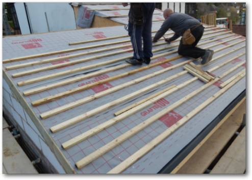 Starting to fit the tile battons starting at the bottom and working up so the tilers can tread on them as they work their way up the roof. Sounds obvious but I have seen roofers not take this approach.