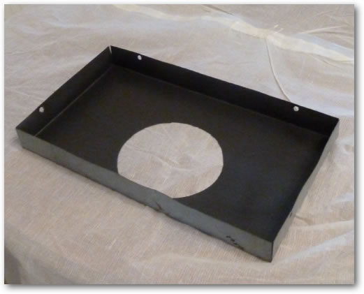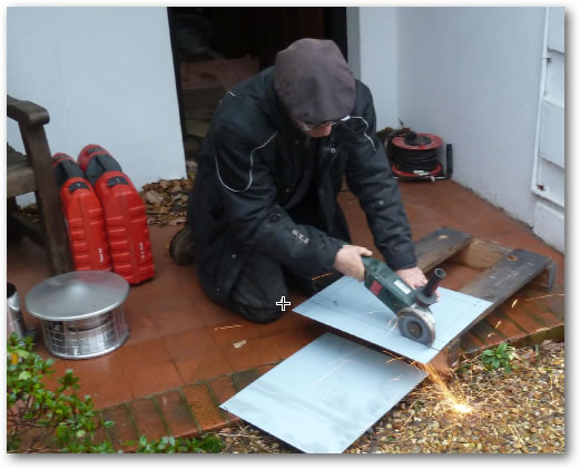 The registration plate is used to block the chimney above the stove and is handmade from galvanised steel sheet using an angle grinder.