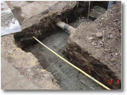 I started with the lower trench and built a bit of shuttering around the mains water pipe. This will be filled with pea shingle and covered with a concrete slab later.