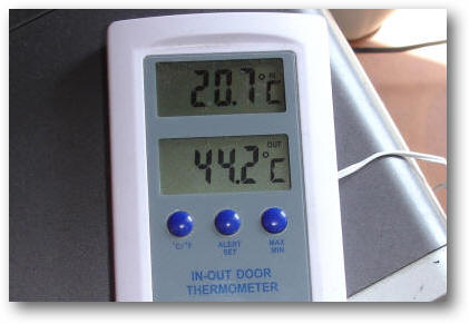 I never had any doubt as to the reason why paint flaked, as a look at the photo below will show. Even in early May when we started getting some hot weather, the temperature on the south facing wall reached 44 degree centigrade - I dread to think what this will get up to in the height of the summer!
